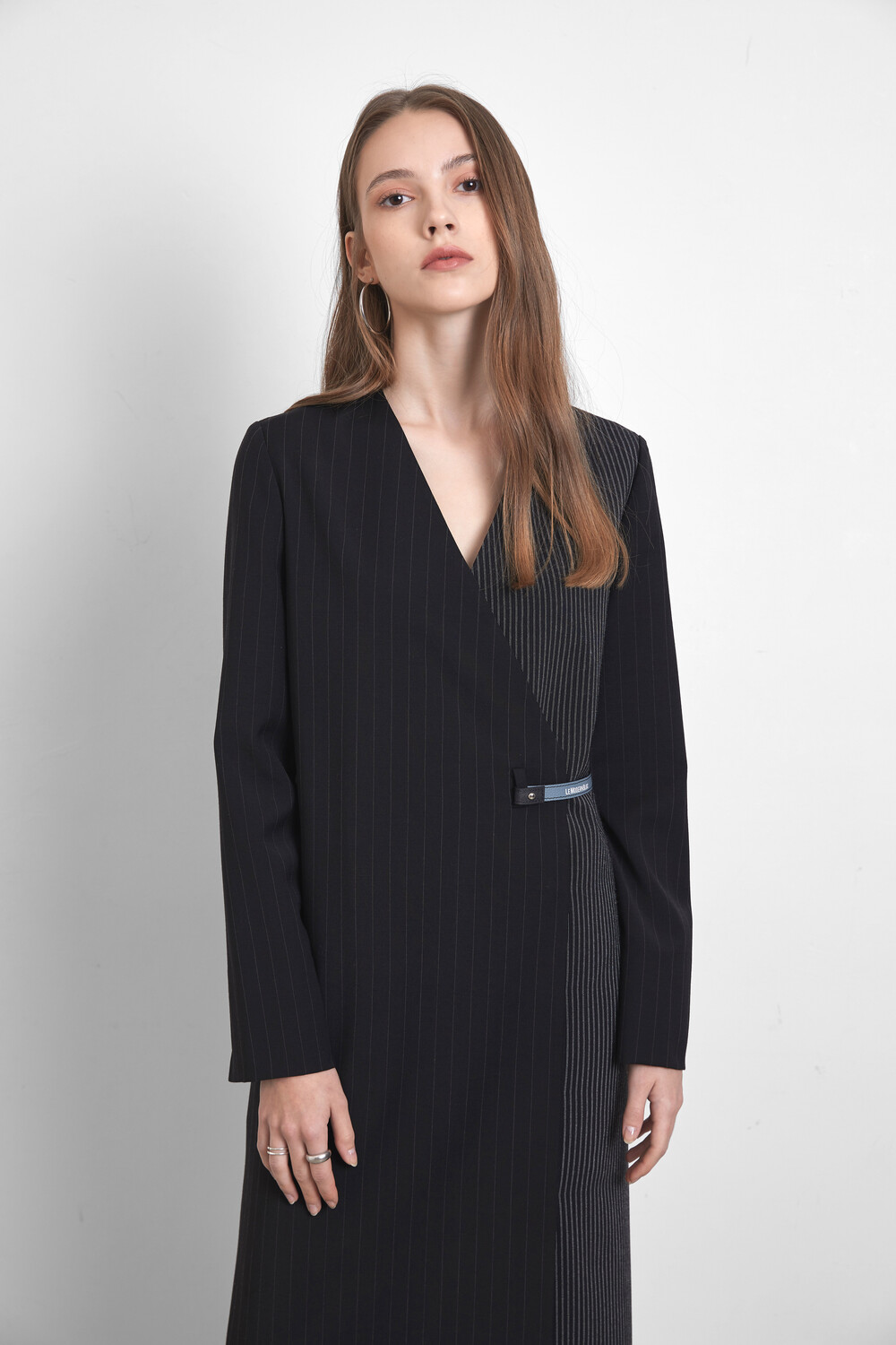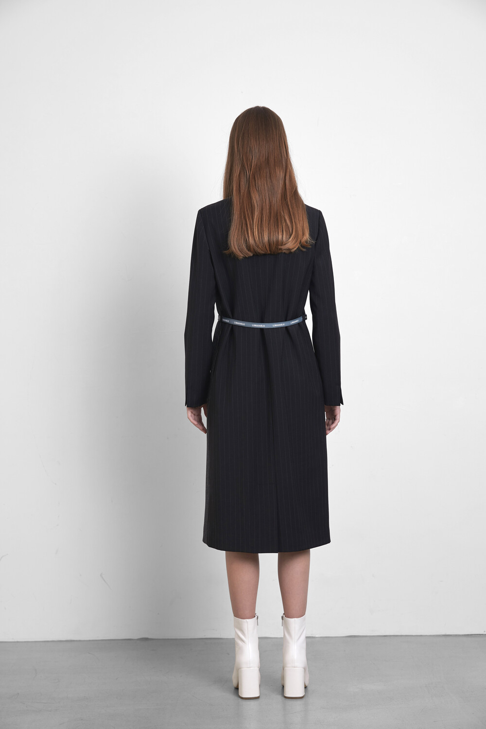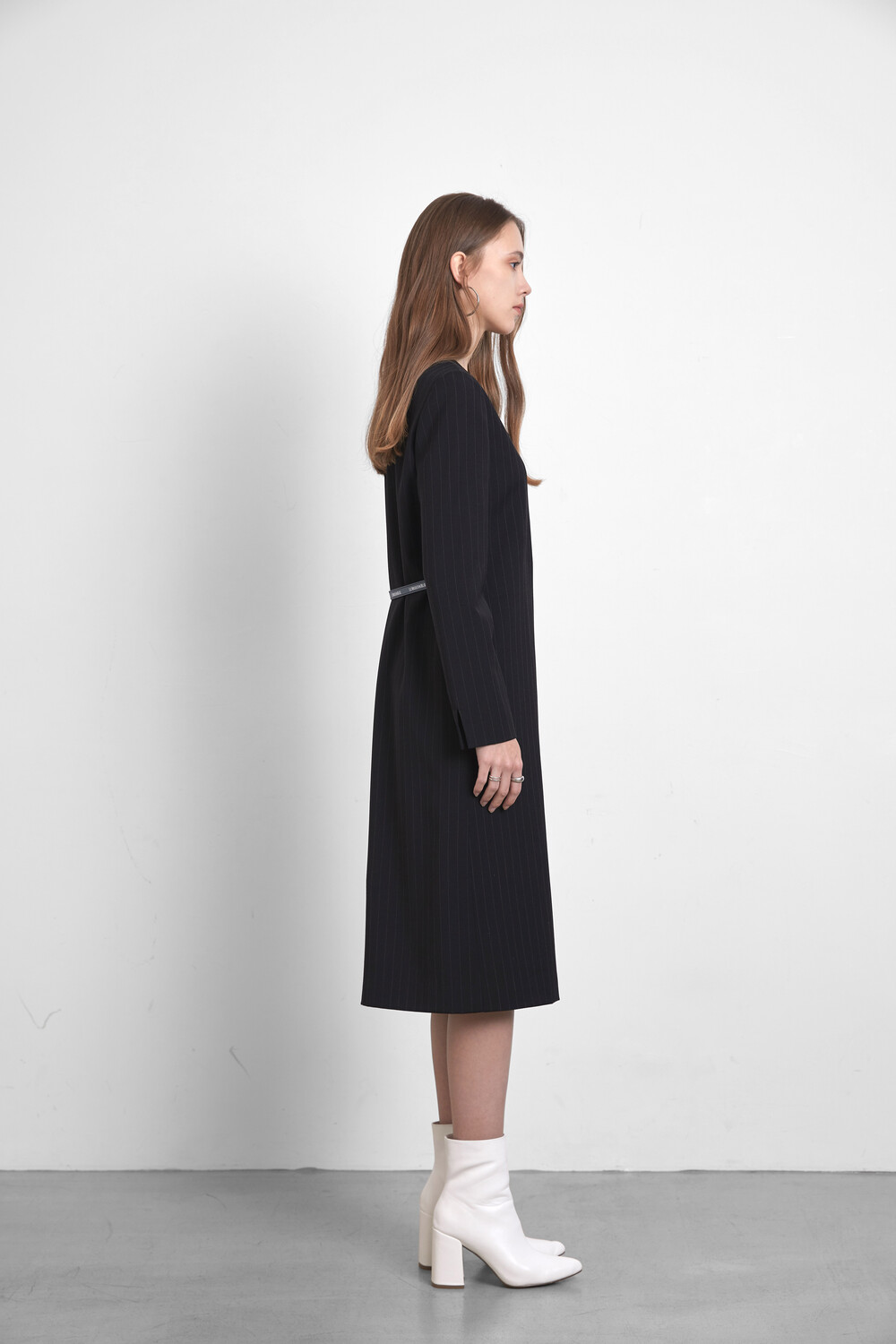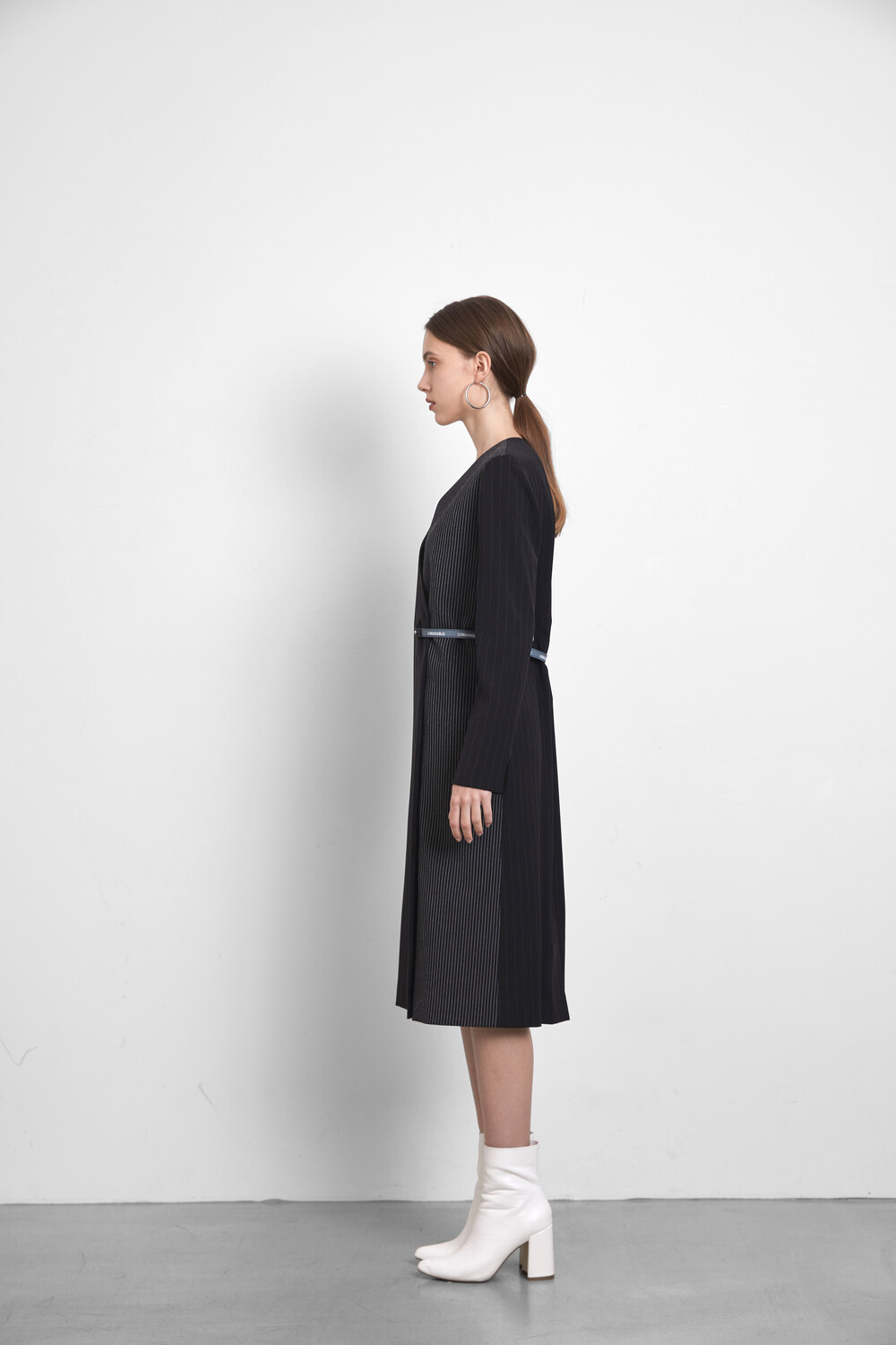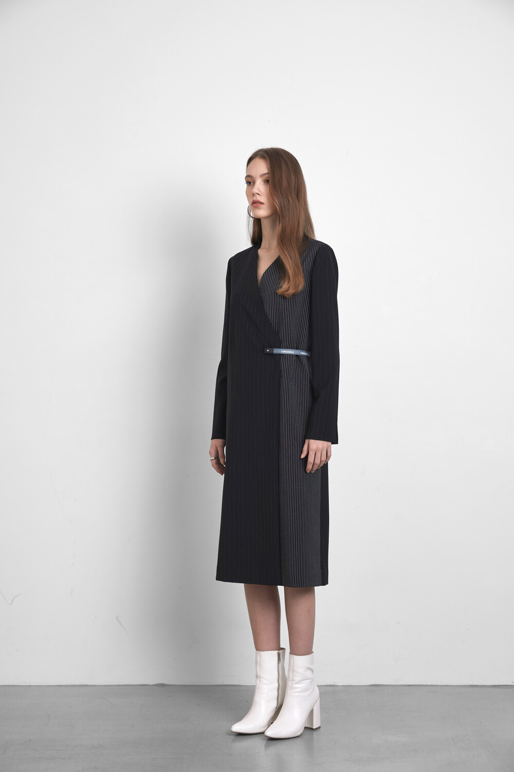 레더 벨트로 웨이스트 라인을 강조하여